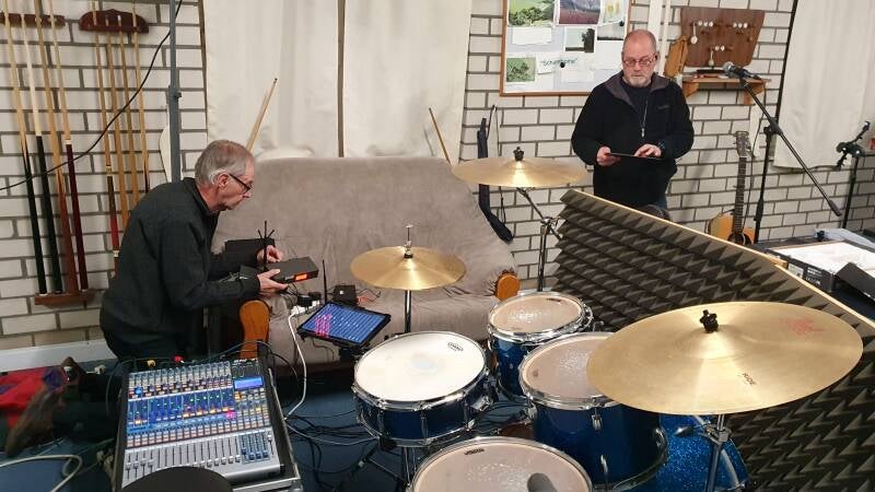 Op de foto in het repetitielokaal zie je Mat Janssen via mengpaneel en tablet, dit systeem regelen en bijsturen.
